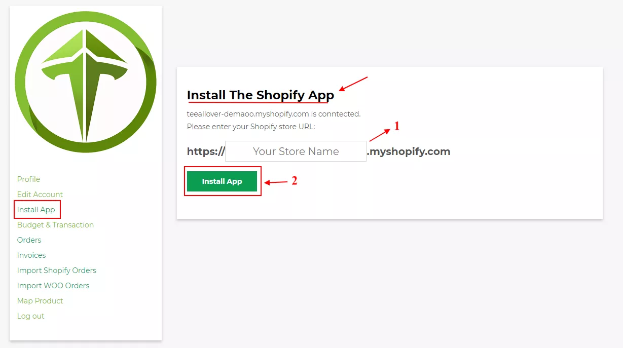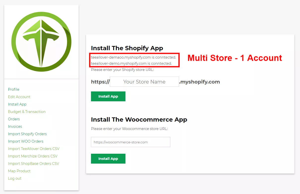 Sau đó mọi thao tác của bạn trên hệ thống pro.teeallover.com đã được kết nối và đồng bộ vơi Apps Shopify.