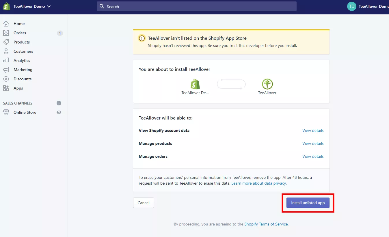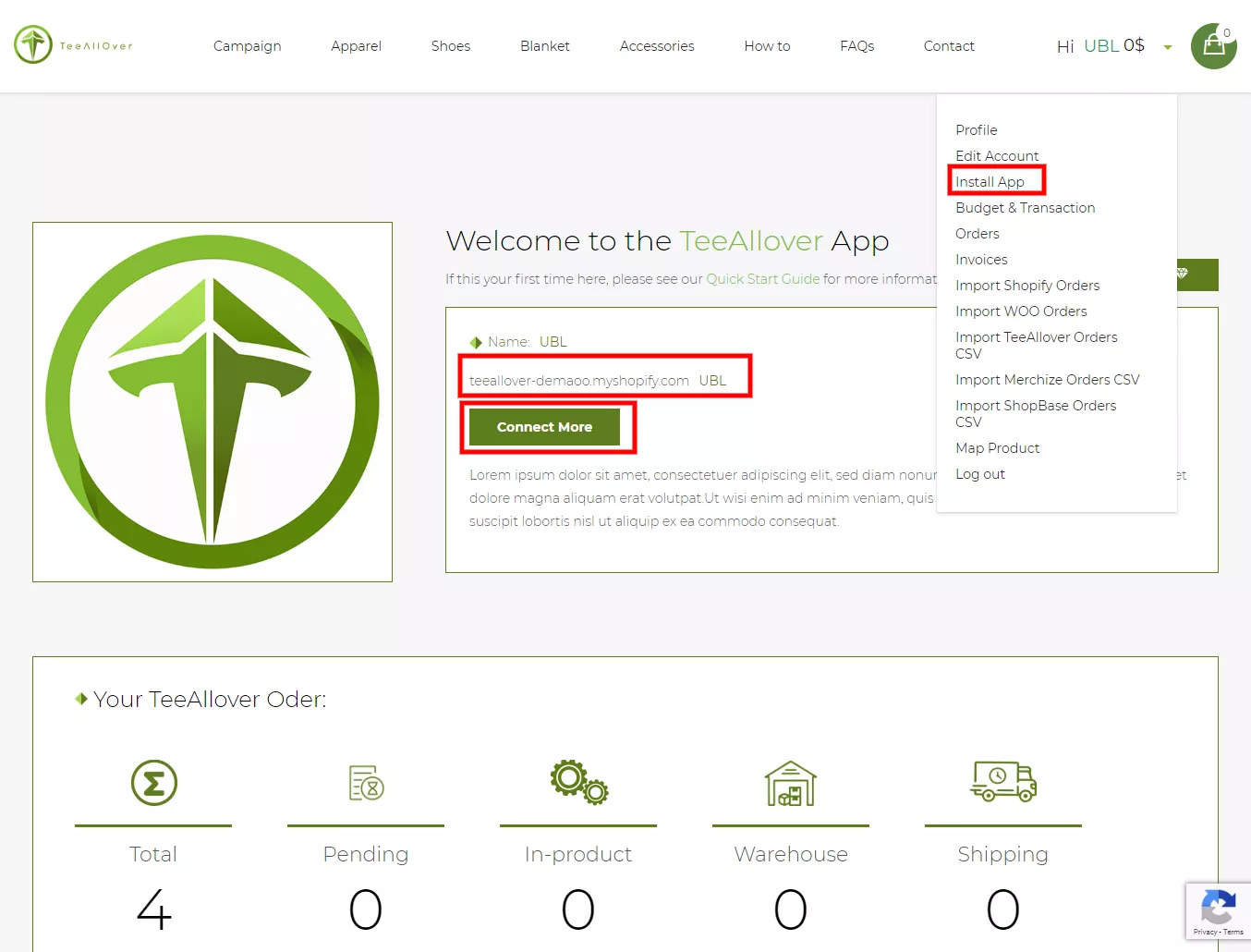 Sau khi kết nối thành công bạn sẽ nhìn thấy TeeAllover App ở trong mục Apps của Shopify.