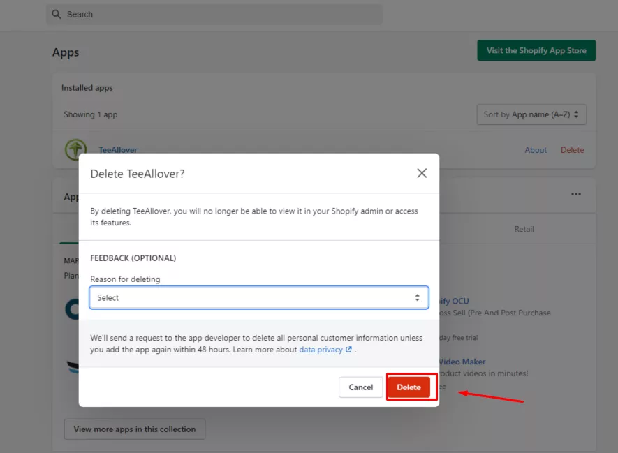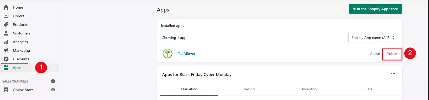 Đầu tiên bạn vào store của bạn cần gỡ kết nối với app. Tiếp tục vào mục “App” – Tìm app Teeallover- Click vào Delete