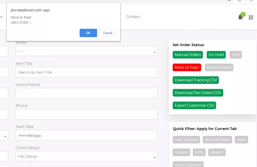 4- Delete: Khi bạn muốn import một order giống như order trước đã có trong hệ thống Teeallover ( trong một store nào đó của bạn) thì bạn phải sử dụng nút Delete để xóa order đó đi rồi import vào lại. Nếu bạn không xóa nó đi mà move to trash thì khi bạn import nó sẽ không nhận dữ liệu order đó nữa.