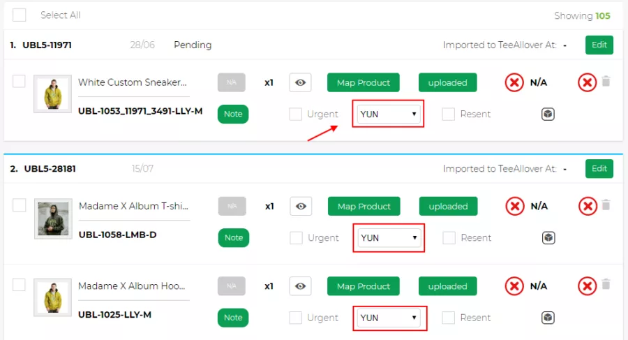 Nếu bạn đang sử dụng ship Yun thì tất cả order ship bằng YUN sẽ được list ra như hình dưới: