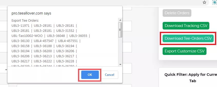 Download Tee-Orders CSV: Khi bạn muốn tổng kết hoặc quản lý từng order theo file csv thì chức năng này đã giúp bạn tiết kiệm một khoảng thời gian đấy! Bạn chỉ cần tick vào ô các order và click vào tab Download Tee-Orders CSV như hình dưới đây: