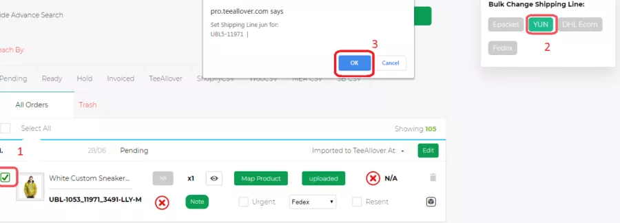 - Đối với phải set line shipping một số lượng lớn thì bạn tick vào ô order bạn cần set sau đó click vào phương thức shipping ( bulk change shipping line) . Sau đó bạn chọn OK thì order đó của bạn sẽ được ship bằng YUN hoặc Fedex,….