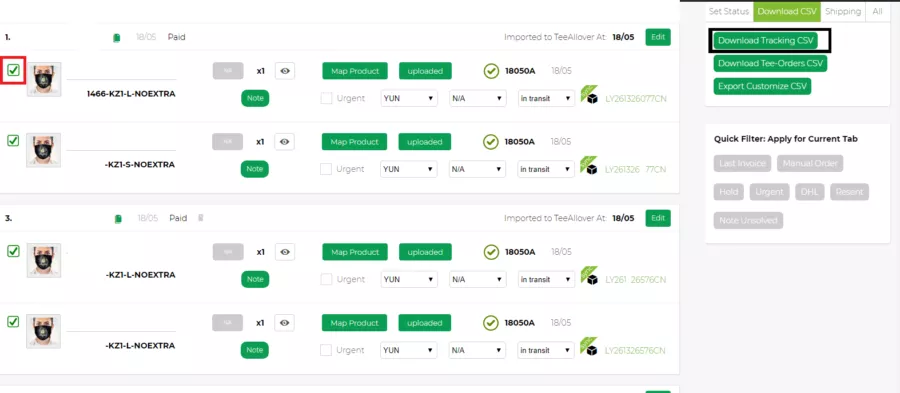 Tiếp theo, Tất cả các order có Tracking nó sẽ hiện ra như hình dưới. Bạn có thể tick vào ô select all – chọn tất cả orders hoặc tick vào order mà bạn muốn tải tracking number xuống rồi click vào tab Download Tracking CSV.