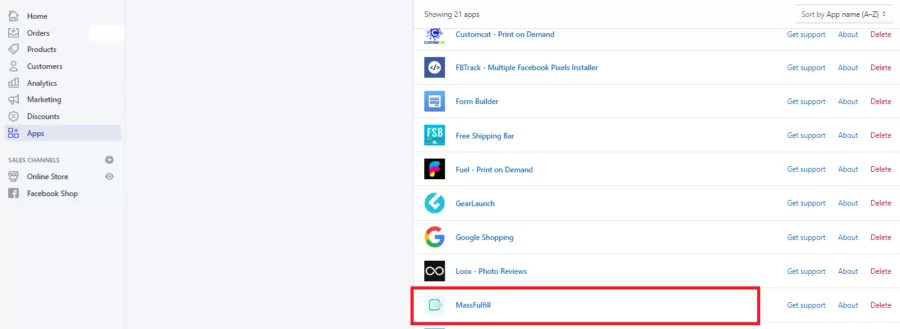 Khi tải file Tracking rồi bạn vào store Shopify ->> vào mục App ->> chọn Massfulfill