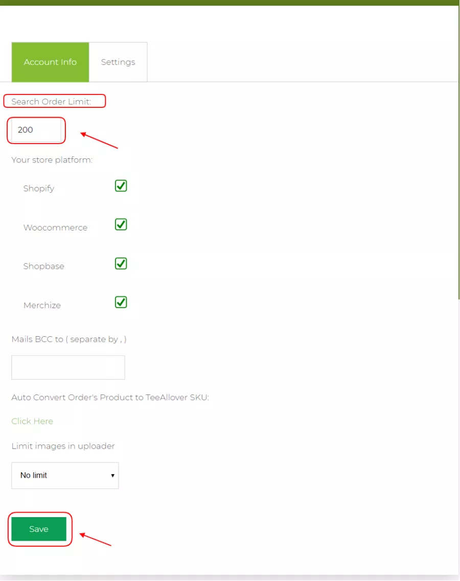 Tiếp theo bấm vào mục Settings, bạn sẽ thấy mục Search order limit: ->> Bạn có thể để số lượng tùy theo nhu cầu của bạn ( min =50 , max=500) =>> bấm Save