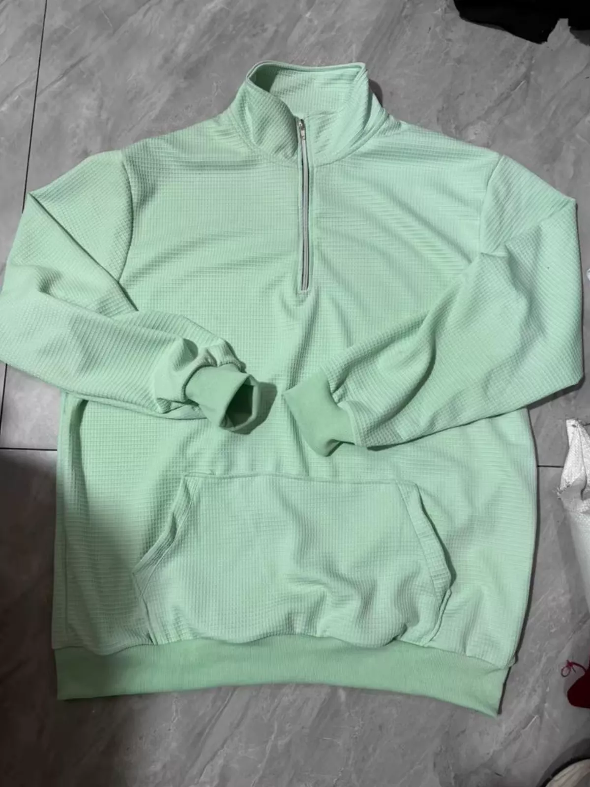 The waffle half zip pullover is made from waffle-textured fabric, offering a soft hand feel with good breathability. The waffle structure helps retain warmth while remaining lightweight and comfortable for everyday wear.