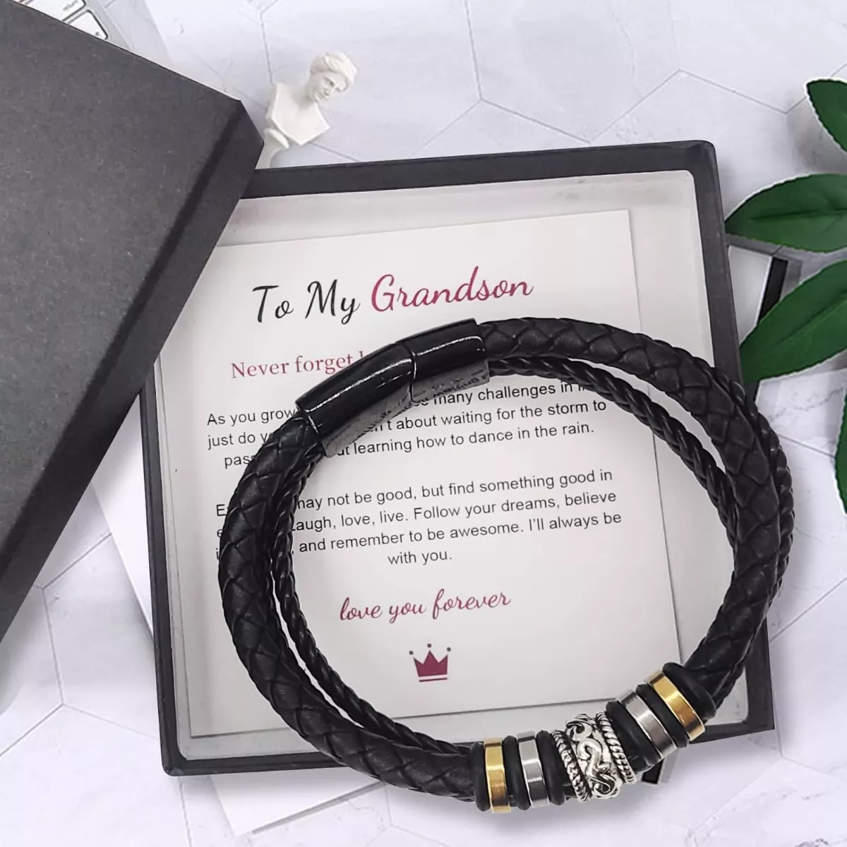 View Base cost hereThe braided vegan leather strap delivers a sleek look while remaining durable. Accented with stainless steel decorative beads, it adds a modern, masculine edge to any outfit. Finished with a black-finish stainless steel clasp for secure wear, this piece combines strength, sophistication, and everyday versatility. The perfect accessory for both casual looks and special occasions.